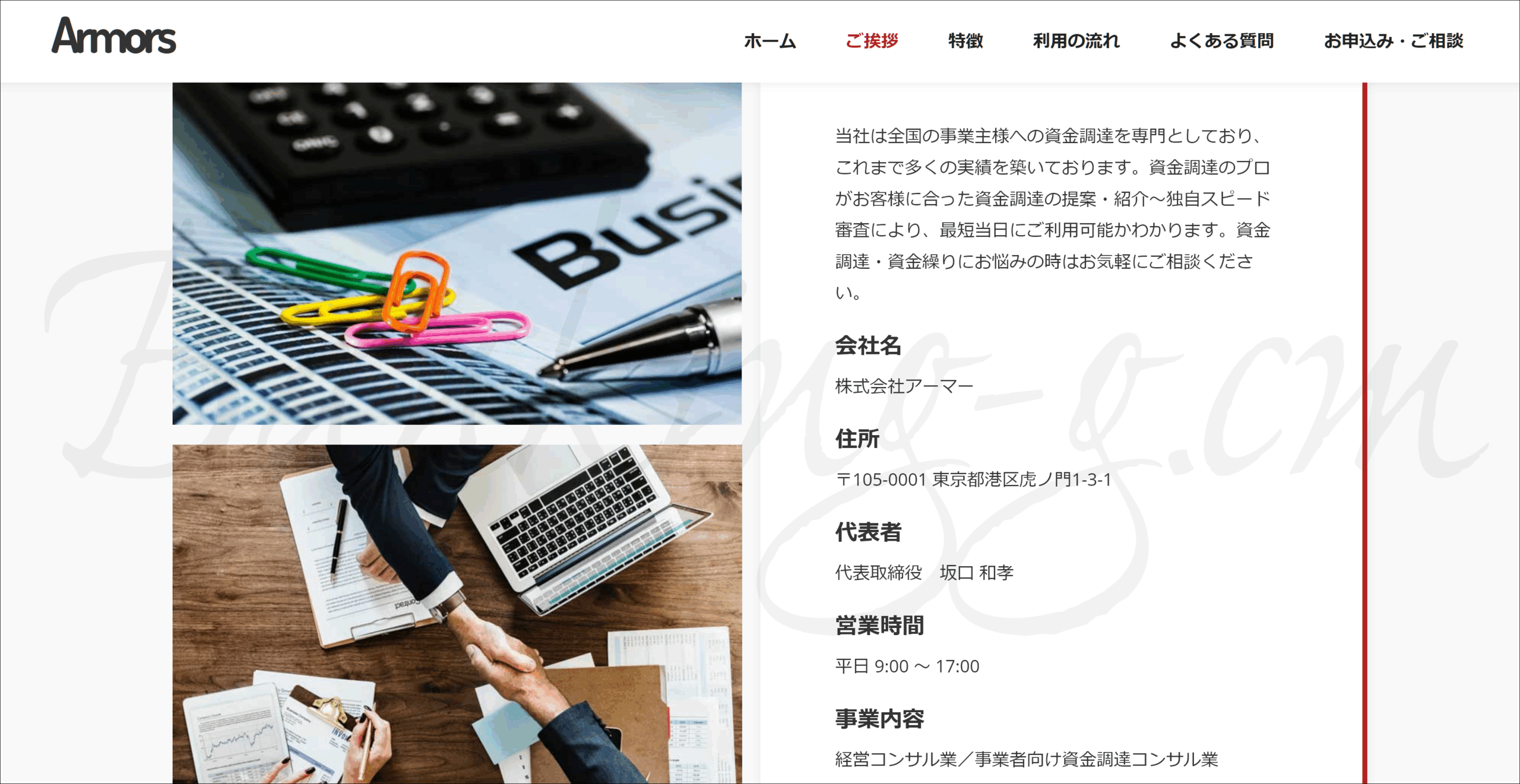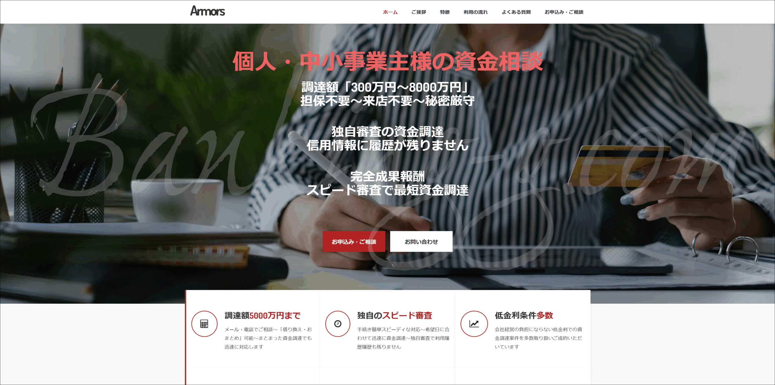 「株式会社アーマー」は資金調達の提案業者を装っているだけの、いつもの融資保証金詐欺業者です。この株式会社アーマーに引っかかって申し込んでみても、紹介される自称融資業者はどれもこれも「返済能力の確認も兼ねて、融資実績の作成のためにまずは融資額の35パーセントを融資担保金としてお納め願います」のような教科書通りの融資保証金詐欺を強要してくるだけとなります。融資マッチング業者を装ってWeb広告を量産しているだけのただの詐欺業者ですので、絶対に引っかからないようご注意願います。