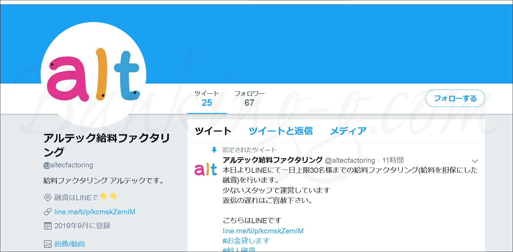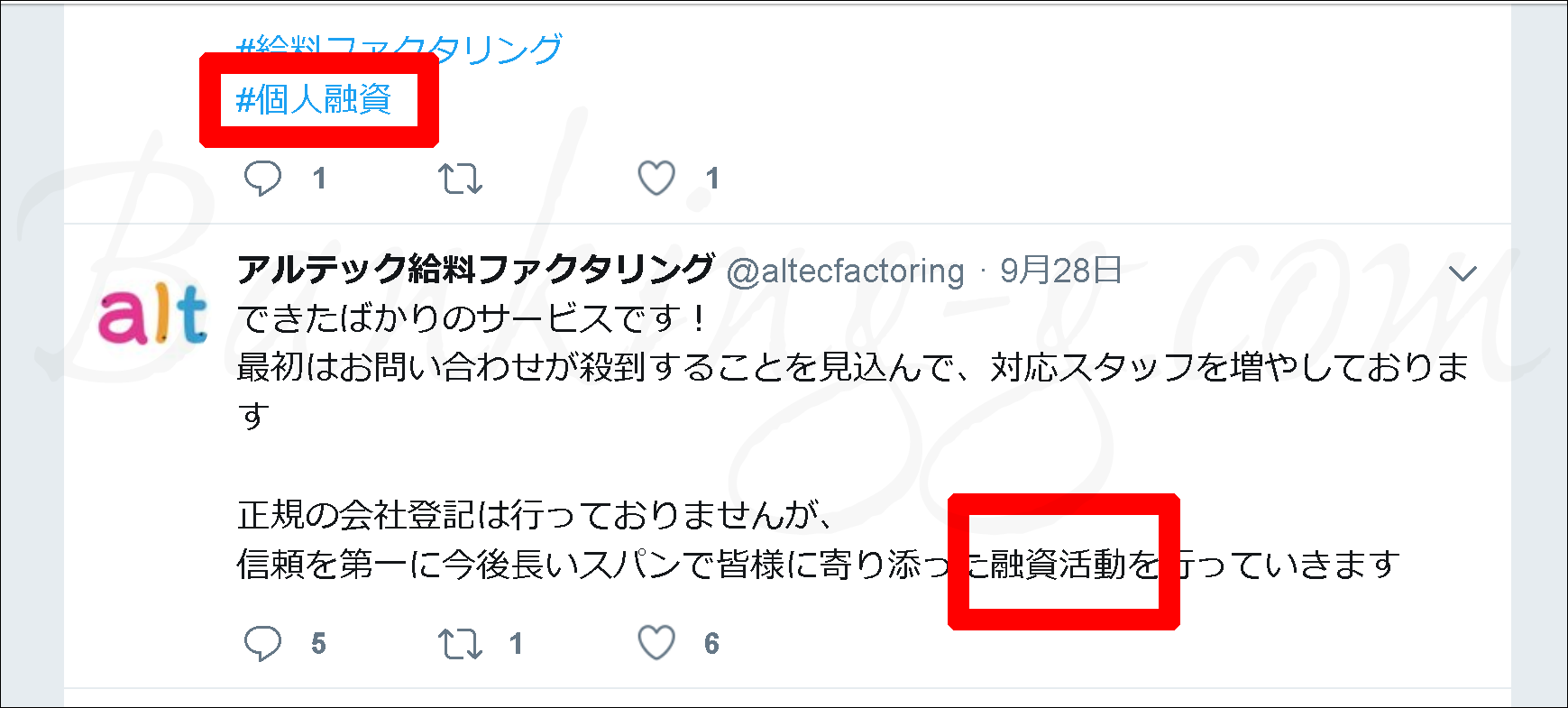 今回この業者のツイッターアカウントには「給料ファクタリング(給料を担保にした融資)」「アルテックは長期返済プランで高額融資が可能です」「個人融資」「融資活動」など、貸金業登録をしていないファクタリング業者が絶対に使ってはいけない言葉がバンバン飛び出しています。ファクタリングと融資の区別が付いていません。これは完全にヤバいやつです。