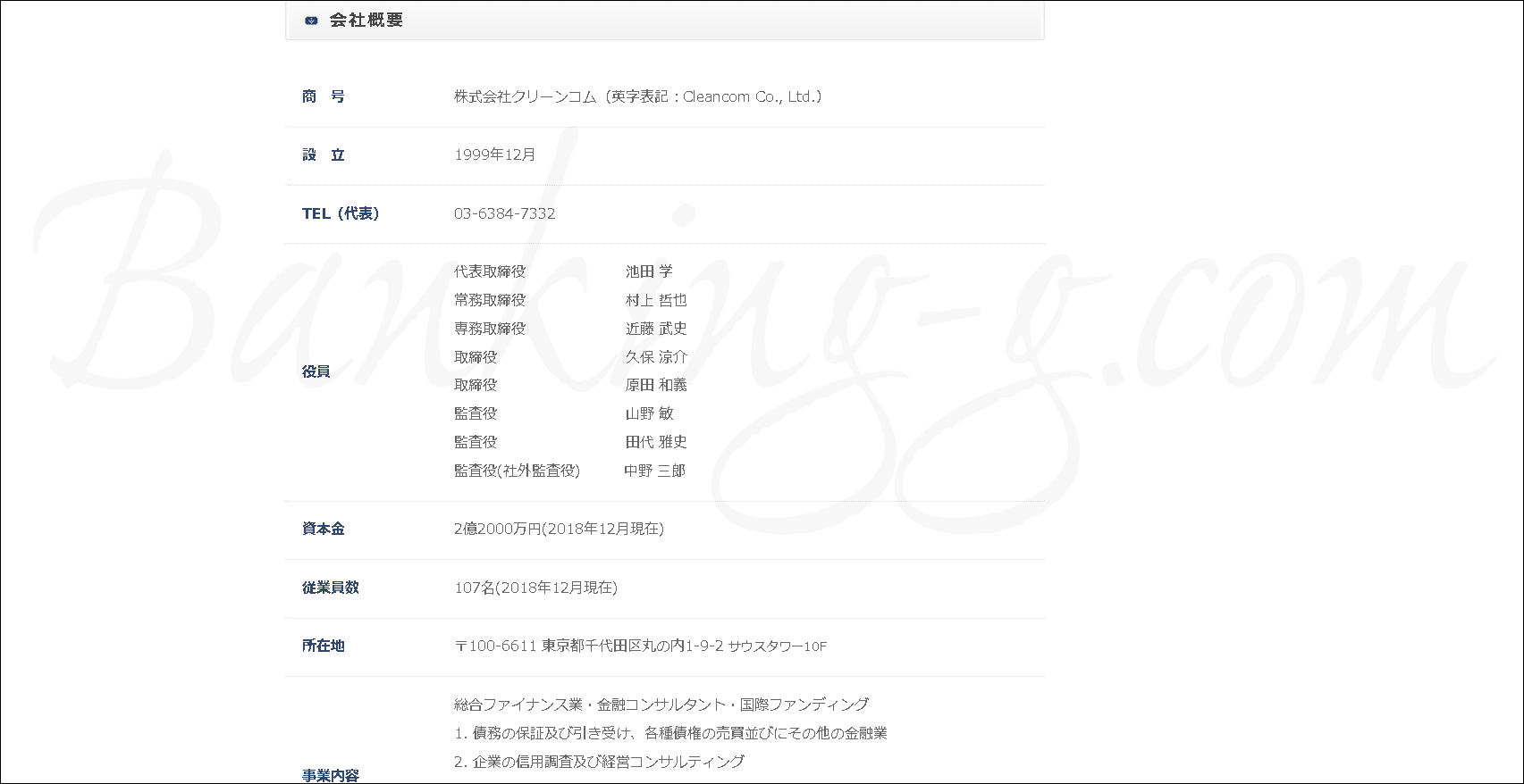 株式会社クリーンコムはいつもの変わり映えのない闇金業者で、平日だろうが週末だろうがお構いなしに頼みもしない融資案内の迷惑ファックス広告を送りつけてくるうえに、それではと融資を申し込んでみても「無事、審査に通りました。つきましては、お口座へお振り込みにてご融資いたしますので、融資額の20パーセントを信用預託金として先払い願います」などと典型的な融資保証金詐欺を仕掛けてくる悪質詐欺業者でもあります。とにかく何らかの形で先にお金を振り込ませようとしてきます。貸金業者を装った使い捨てサイトをやみくもに量産しているだけで、もちろん法人登記が確認できない自称株式会社にすぎません。そもそも、正規の登録すらないモグリの危険業者なので、絶対に個人情報を送らないようにしてください。