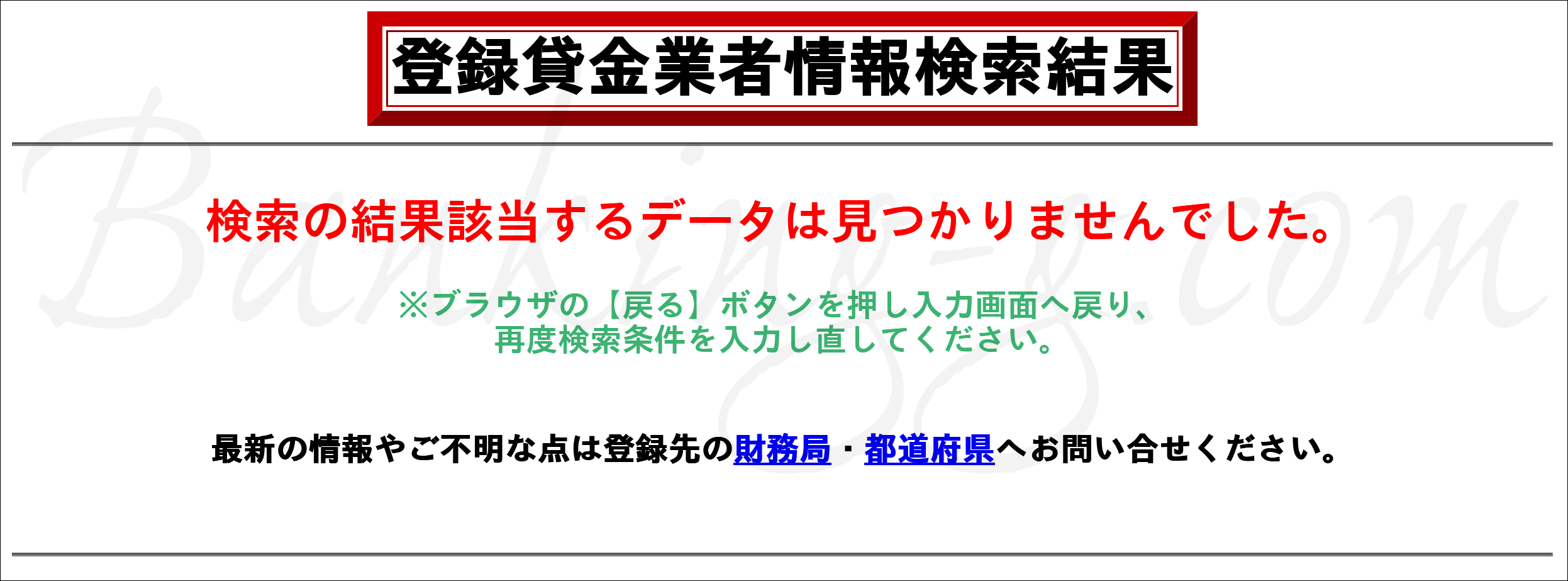 本物の貸金業者であるなら、融資営業に使われている電話番号は例外なく金融庁の公開データベースで確認を取ることができます。融資の勧誘や広告、宣伝を行うにあたって使用可能な電話番号は、貸金業法によって事前登録が済んだ電話番号に限られているからです。しかしながら、今回の電話番号「0120438765(0120-438-765)」を金融庁が公開している登録貸金業者データベースで確認しようと検索しても、一切ありません。文句なしのモグリ業者なのです。それなのに、正規の貸金業者気どりなのですから、お話になりません。