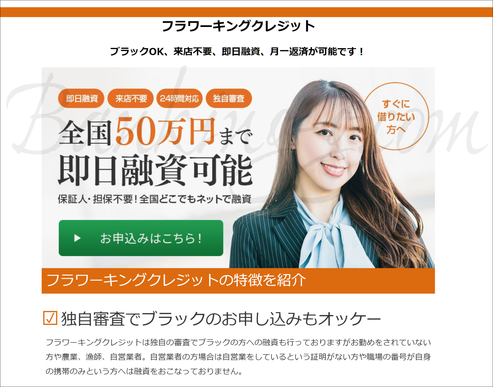 「フラワーキングクレジット」はいつものホームぺージ系の闇金業者です。頼んでもない融資案内の迷惑ショートメール広告を何度もしつこく送りつけてくるだけで、そもそも、国に登録のない危険な違法業者なので、絶対に引っかからないようにしてください。