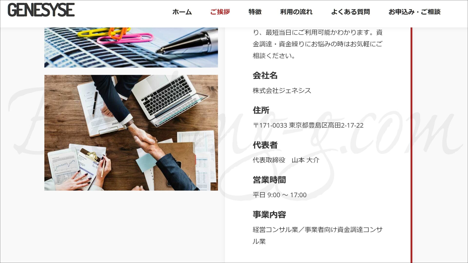この株式会社ジェネシス(〒171-0033 東京都豊島区高田2-17-22/山本大介代表)のグループは詐欺業者なので、そもそも貸金業法という法律を知りません。そのため、詐欺がどうこう以前の問題として、まず自称する会社情報を見ると一目で、手を出すべきではない違法業者だとわかってしまいます。
