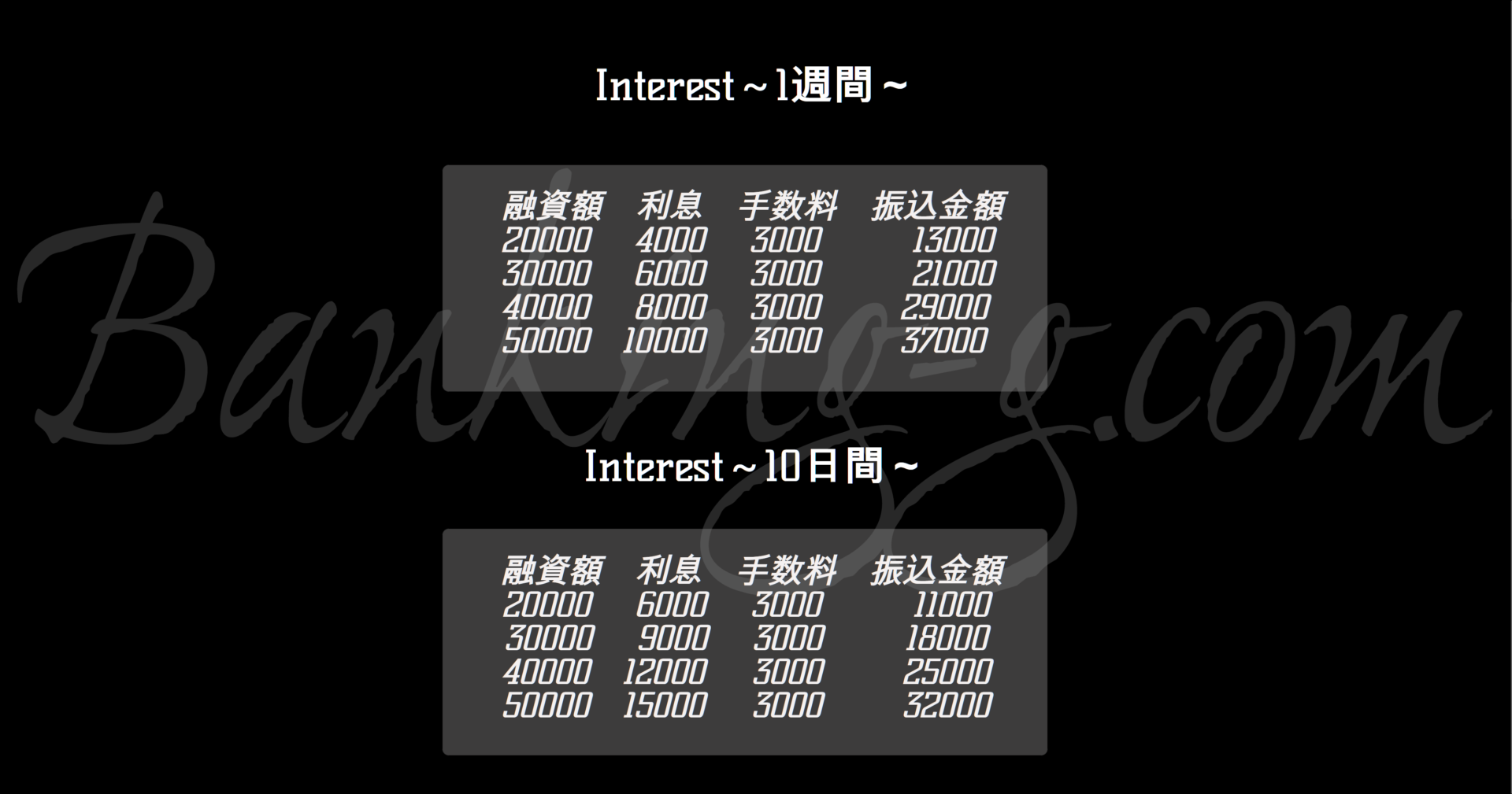 ホームページで説明されている限りでは、このシャイロックの利息は1週間2割か10日で3割に手数料が3,000円という、一昔前までのスタンダードな利息サイクルを標榜しています。