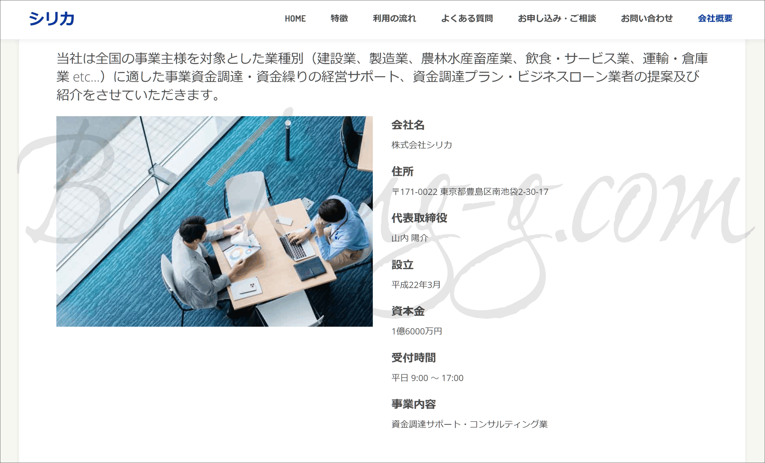 「株式会社シリカ」は資金調達業者を装っているだけの、いつもの融資保証金詐欺グループです。この株式会社シリカに申し込んだところで、紹介される自称融資業者はどれもこれも典型的な融資保証金詐欺を強要してくるだけとなります。融資マッチング業者を装ってWeb広告を量産しているだけのただの詐欺業者ですので、絶対に申し込まないようにしてください。