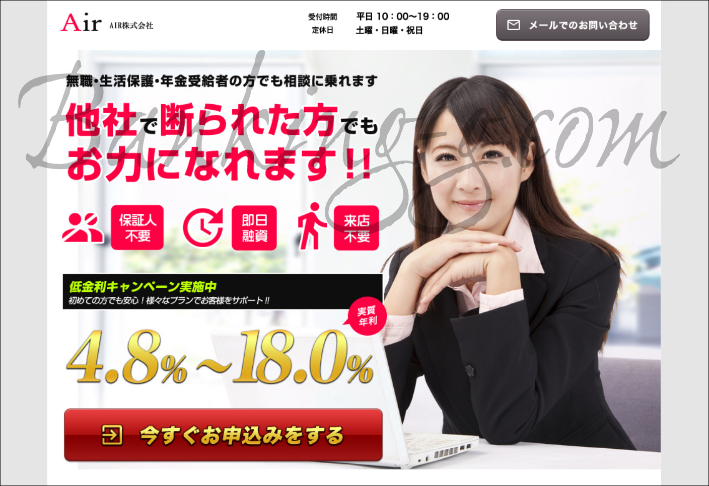 そもそも、Airのホームページを見ると一目で違法な業者だとわかってしまいます。貸金業法によって厳しく禁じられている勧誘表現を堂々と使っているからです。「無職・生活保護・年金受給者の方でも」「他社で断られた方でもお力になれます!!」などは詐欺業者ご用達の表現なのです。この手の審査甘い系の言い回しは詐欺サイトでしか使われない完全に違法な表現なので是非覚えておいてください。