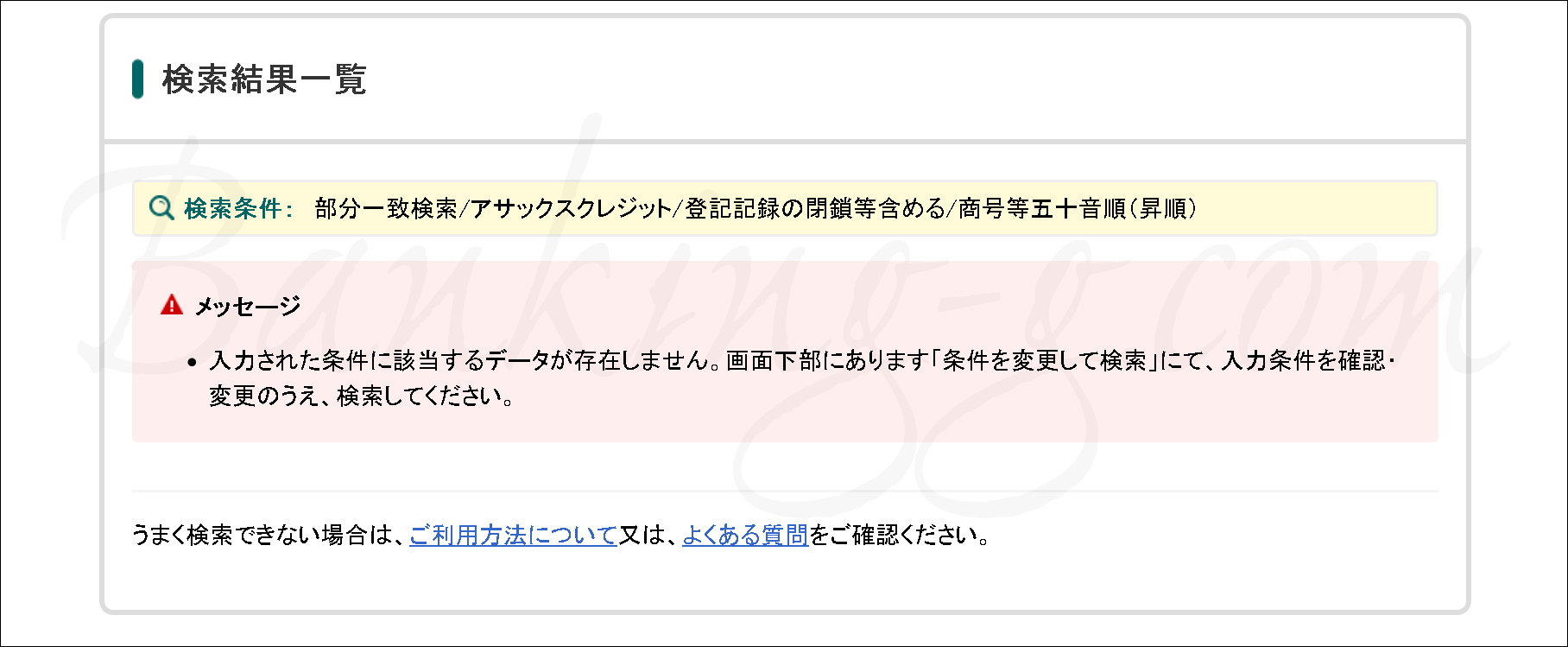 そもそも、貸金業登録がないだけでなく、登記簿検索をしても現在日本に「株式会社アサックスクレジット」という株式会社自体が存在していません。勝手に株式会社を自称しているだけの詐欺組織ですので、絶対に個人情報を送信しないように気をつけてください。