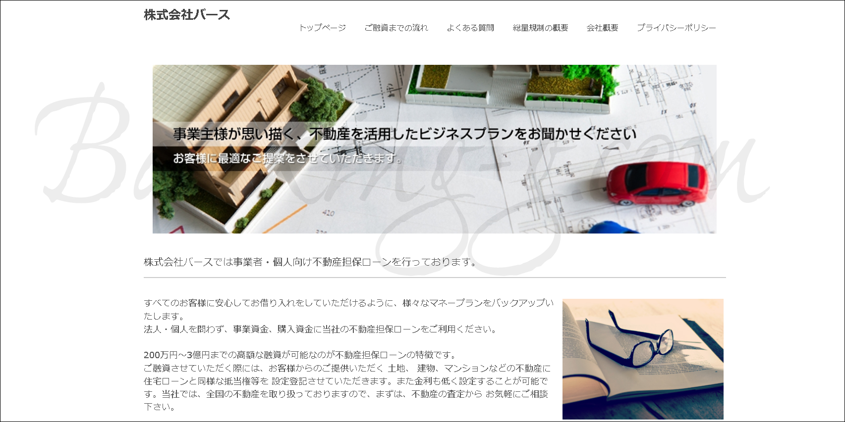 たとえば、5,000万円まで全国即日融資OKなこちらのビジネスローンは来店不要で無担保ですし、現在盛大に新規貸付キャンペーンを繰り広げており、顧客獲得に力を入れています。さすが、たとえ赤字決算や税金の未納があっても融資OKなだけのことはあります。私だったら迷うことなくこちらを選びます。もちろん、こちらの会社は金融庁に正規登録されてある本物の融資会社ですし、来店不要で無担保とはいえ、ビジネスローンとなるので総量規制の対象外として現在のお借入残高に影響を受けない融資となります。今回のバースのように本当の住所すら一切不明の危険な無登録業者と比べて、一体どちらが融資実行力がありそうでしょうか。