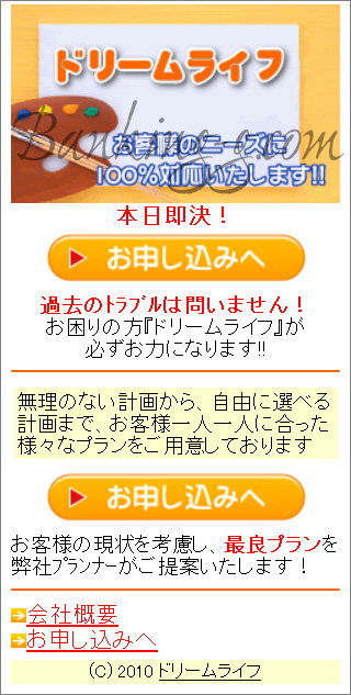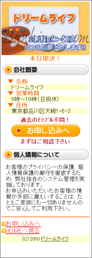 ドリームライフはいつもの変わり映えのない闇金融です。このデザインもいい加減に見飽きてきましたが、無登録で勝手に貸金業を名乗っている危ないモグリ業者ですので、絶対に引っかからないようご注意願います。