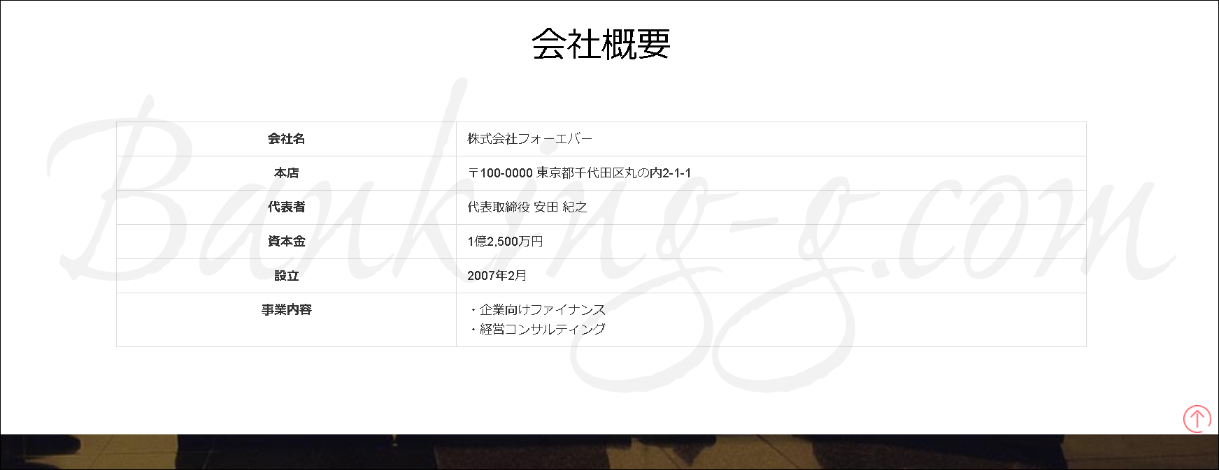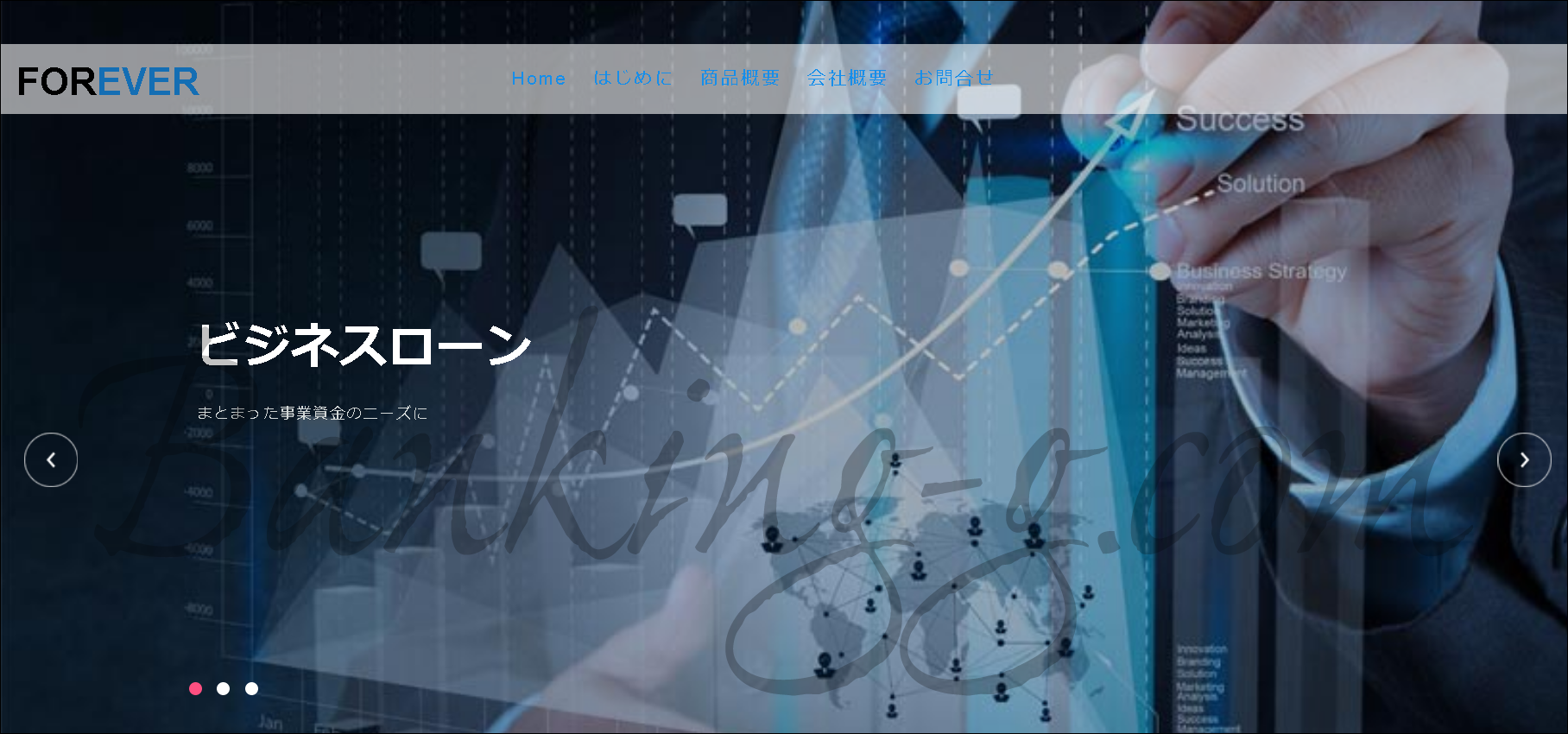 株式会社フォーエバーはいつもの闇金融で、朝早くから夜中まで頼んでもいない融資ファックス広告をしつこく送りつけてくるだけでなく、それならばと借入を申し込んでも「審査に通りました。早速、お口座へお振り込みにてご融資させていただきますので、融資額の15パーセントを保全供託金として先払い願います」などと教科書通りの貸します詐欺である融資保証金詐欺を披露してくれる手付け金詐欺業者でもあります。ローン業者に成りすまして使い捨てデザインでサイトを量産しているだけで、もちろん株式会社でもなく法人登記もなされていません。そもそも、国に登録のないモグリの危険業者なので、絶対に申し込まないようにしてください。