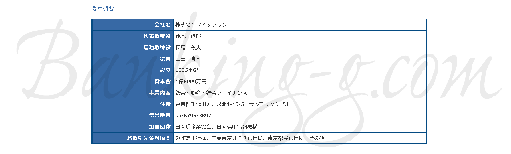 今回この業者のホームページ上に記載されてある所在地は東京都千代田区九段北1-10-5 サンブリッジビルですが、いつもの通り、この住所にクイックワンなど存在していませんでした。