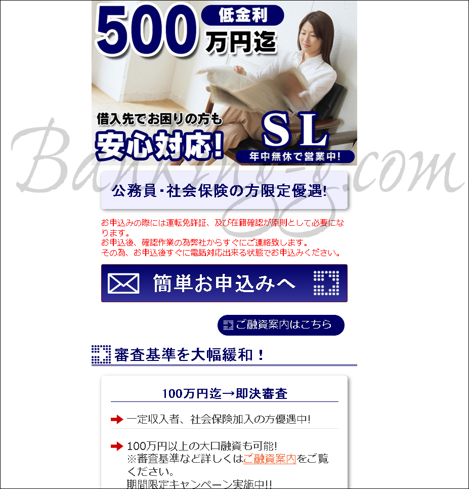 そもそも、SLのホームページを見ると一目で違法な業者だとわかってしまいます。貸金業法によって厳に禁じられている勧誘表現が普通に使われているからです。「審査基準を大幅緩和!」などは詐欺業者だけが愛用する言い回しなのです。この手の審査甘い系の言い回しは詐欺サイトでしか使われない完全に違法な表現なので是非覚えておいてください。