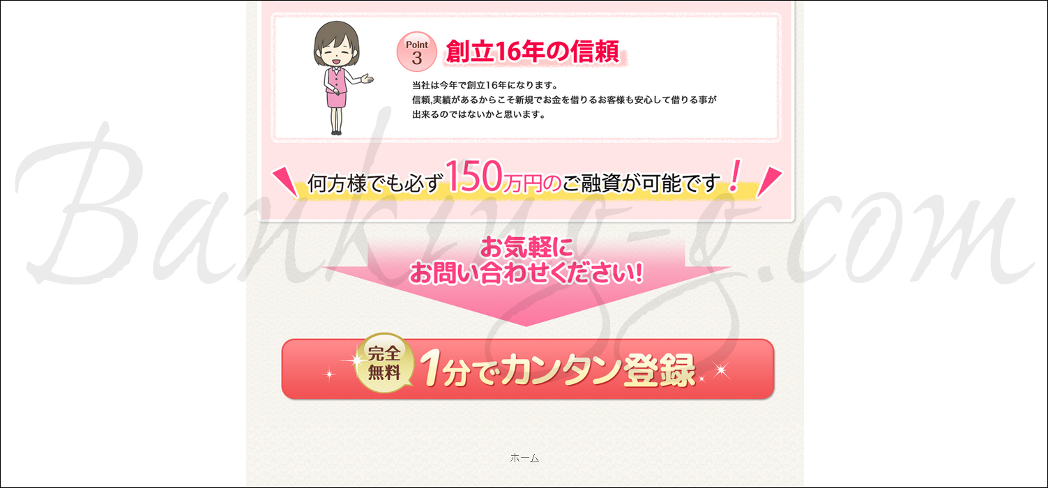 そもそも、トップのホームページを見ると一目で違法な業者だとわかってしまいます。貸金業法によって厳しく禁じられている勧誘表現を普通に使っているからです。「何方様でも150万円までは融資お約束」「ブラックになってしまった方、生活保護を受けている方でも当社であれば融資が可能」「ご相談して頂いて貸せないという事は御座いません」などと、もはやどこからも借りられなくなっているブラックリストの多重債務者へも絶対に貸せるかのように装うなど、これらはすべて詐欺業者専用と言っても良い言い回しなのです。この手の審査甘い系の言い回しは詐欺サイトでしか使われない完全に違法な表現なので是非覚えておいてください。