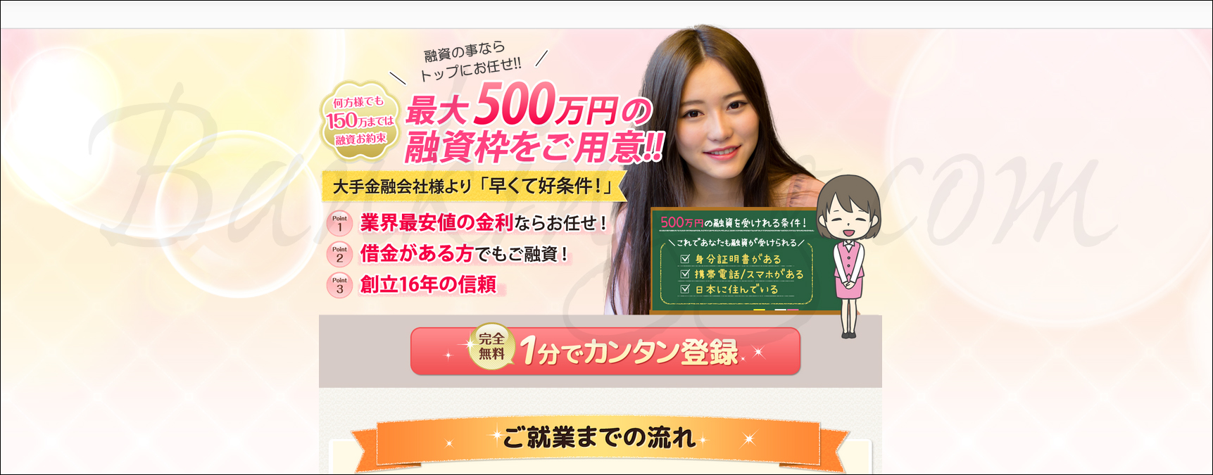 トップはいつもの闇金業者で、平日だろうが週末だろうが関係なく夜遅くまで迷惑メールを送りつけてくるだけでなく、融資を申し込んでみても「本融資を実行するには、新しい電話回線を取得して信用情報を書き換える必要があります」などと最新のiPhoneやiPadを分割契約させて奪い取ろうとするような、マニュアル通りの特殊詐欺業者でもあります。融資会社のふりをして使い捨てデザインのサイトを量産しているだけで、そもそも、勝手に貸金業を名乗っているだけの危険な無登録業者ですので、絶対に個人情報を送らないようにしてください。