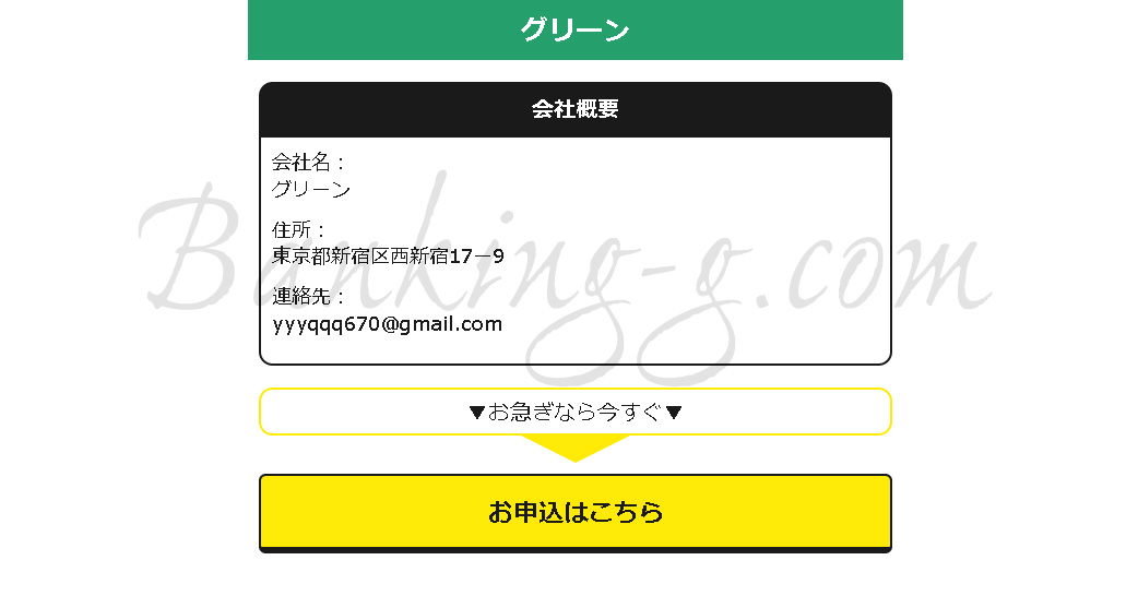 現在、正規登録会社で社名に「グリーン」と名が付き且つ、今回のヤミ金に狙われたらしき会社がいくつか存在しているので、念のために正しい情報を記載しておきます。くれぐれも間違えないようにしてください。