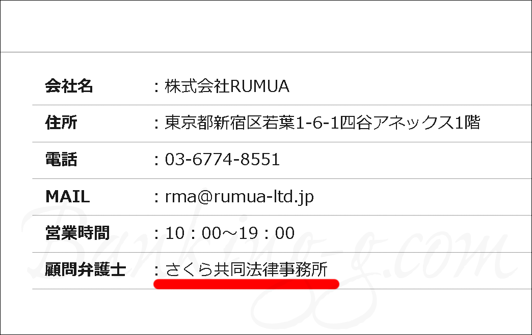 RUMUA(株式会社RUMUA)の顧問は、弁護士名ではなく「さくら共同法律事務所」となっていました。七福神と同様に以前は公式サイトに記載があった顧問表記が現在は削除されているので、「いました」と過去形です。こちらも表記が削除されたからといって顧問を降りているとも限らないのでご留意ください。