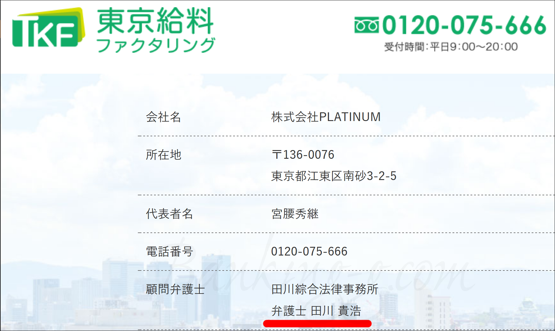 東京給料ファクタリング(株式会社PLATINUM)の顧問を務めるのは、田川綜合法律事務所の田川貴浩弁護士です。各業者の公式サイトで確認できる限りでは、こちらの田川貴浩弁護士が顧問を務めるのはこの一社のみです。