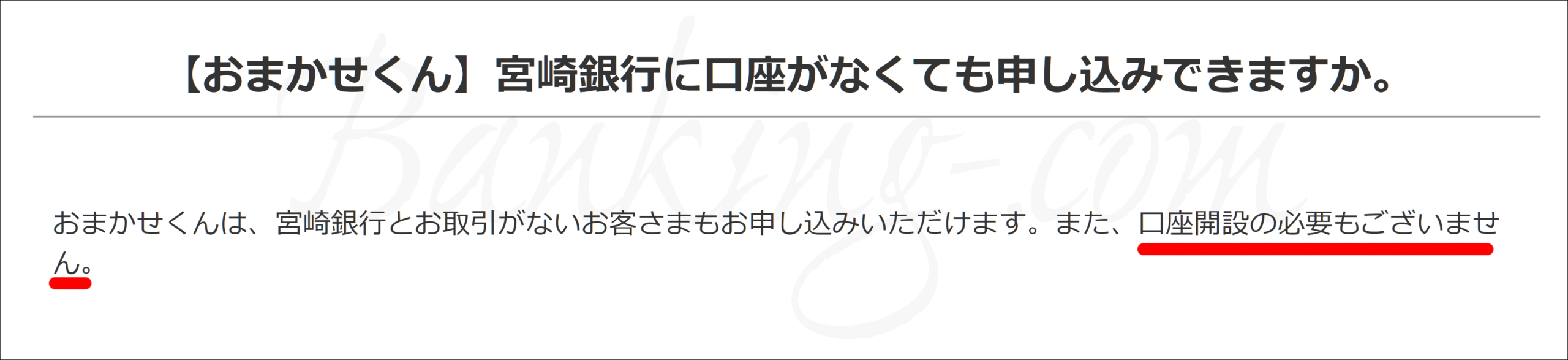 言うまでもないですが、宮崎銀行カードローンの「おまかせくん」は、宮崎銀行の口座を開設しなくとも借りられます。