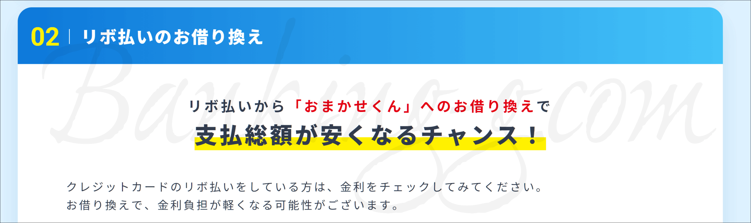 また、宮崎銀行のカードローンが「強いなあ」と感じるのは、公式ホームページ上で「リボ払いからの借り換え」を高らかに勧めている点です。これもなかなかできることではありません。公式ホームページ上でリボ払いからの借り換えを勧めてくれる銀行カードローンなど、私は他に知りません。